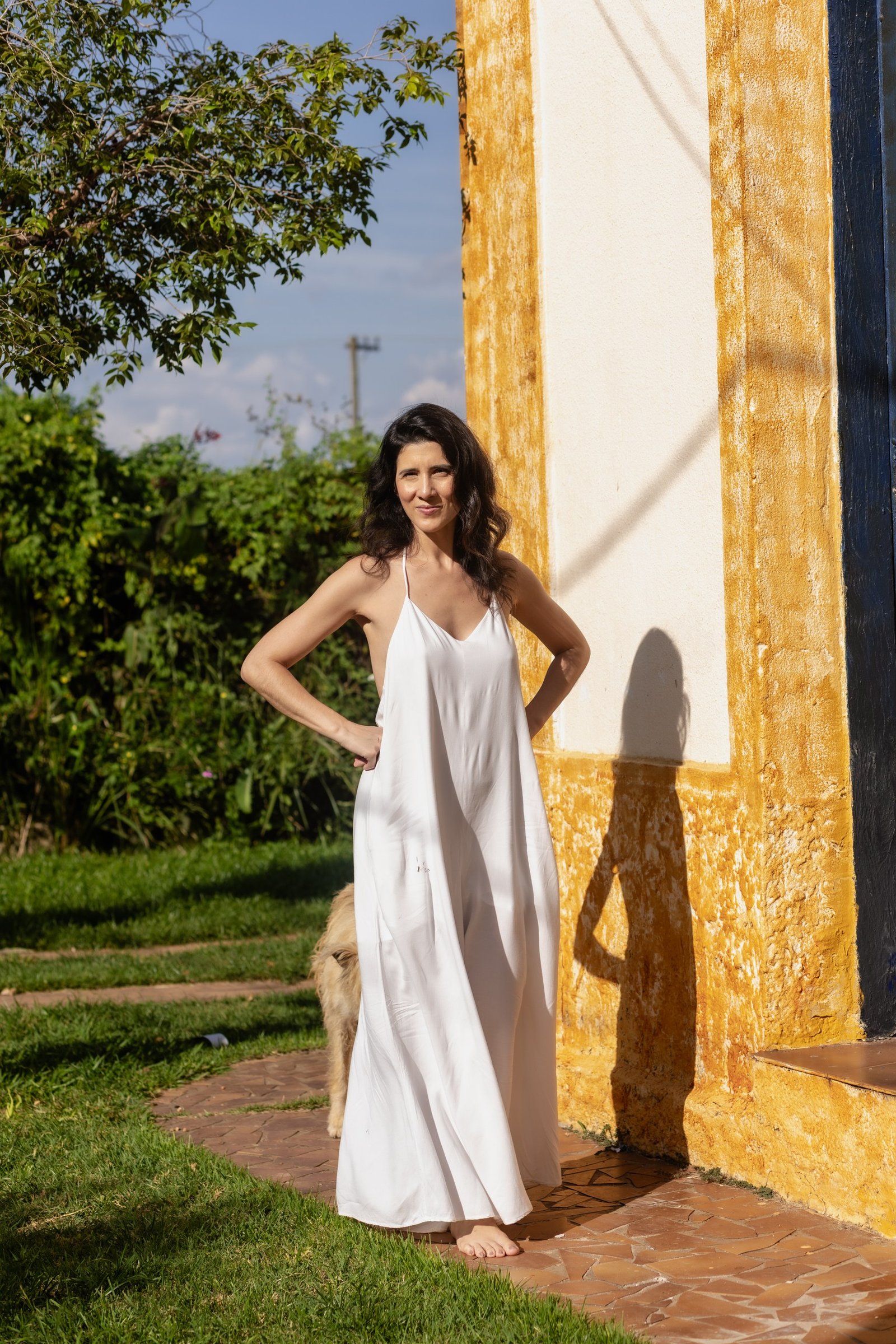 A saia acompanha o caminhar com fluidez e enraizamento.