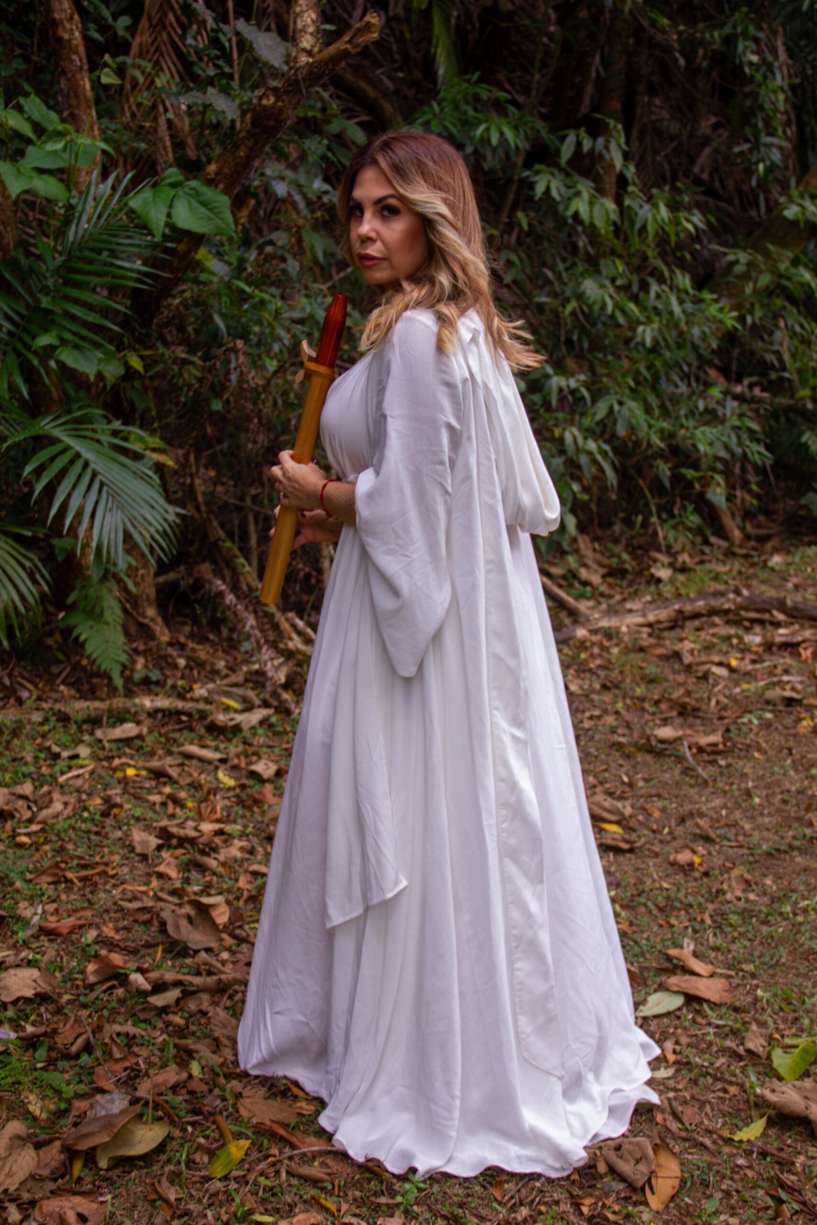 Compondo essa jornada, o Kimono Águia pousa suave sobre os ombros, trazendo o acolhimento do capuz e o voo da alma. Seu tecido fluido e claro simboliza a conexão com o céu, com os ciclos e com a sabedoria ancestral das mulheres que alçam voo.