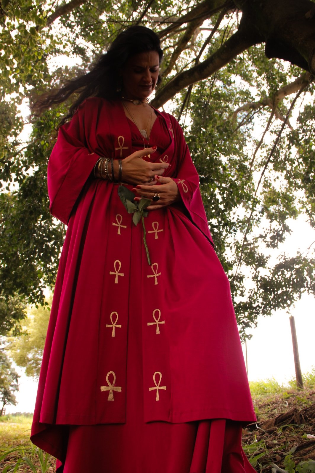 A saia acompanha o caminhar com fluidez e enraizamento.Uma vestimenta para rituais, celebrações, momentos de passagem — ou simplesmente para habitar quem você é.