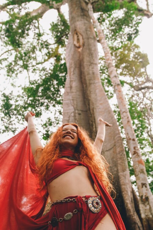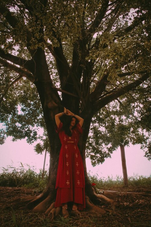 A saia acompanha o caminhar com fluidez e enraizamento.Uma vestimenta para rituais, celebrações, momentos de passagem — ou simplesmente para habitar quem você é.