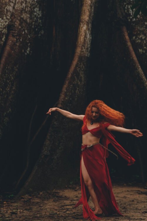 Maria Madalena aqui não é símbolo de culpa — é corpo consciente, mulher inteira, espírito encarnado.O vermelho profundo evoca vida, sangue, amor e coragem.