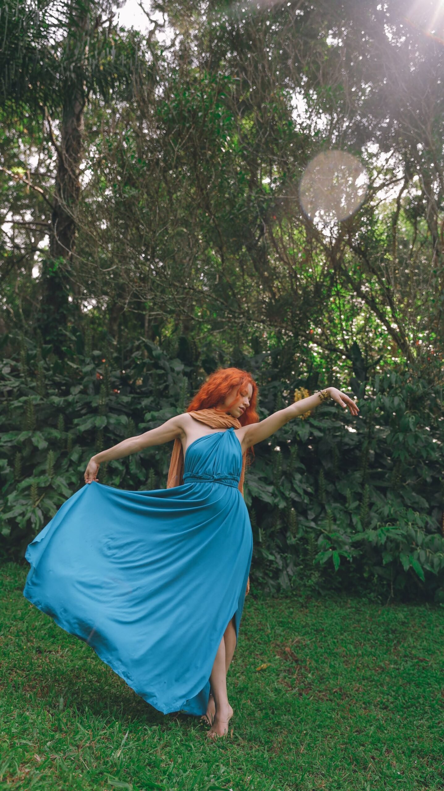 Confeccionado em viscose leve como o ar, este vestido envolve o corpo com suavidade, revelando um visual que reflete luz, magia e divindade. Uma peça que ilumina sua presença e desperta encantamento em cada movimento. -