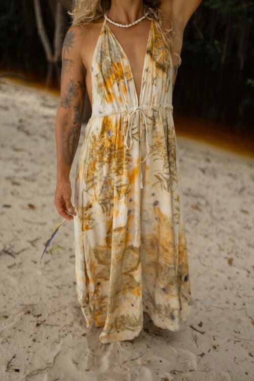 O Vestido Juremah é uma celebração da abundância e beleza que a natureza nos oferece. Com sua estampa botânica única e cheia de vida, este vestido é mais do que uma peça de roupa, é um convite para honrar a força e a exuberância do nosso mundo natural. Sinta-se conectada à essência da Terra e irradie toda essa potência por onde passar!”“O processo natural do eco print é um verdadeiro ritual artístico.
