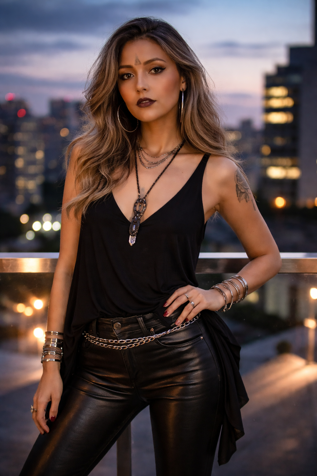 Juntos, eles criam um look ritualístico, etéreo e poderoso — perfeito para quem vive a moda como uma extensão da alma.