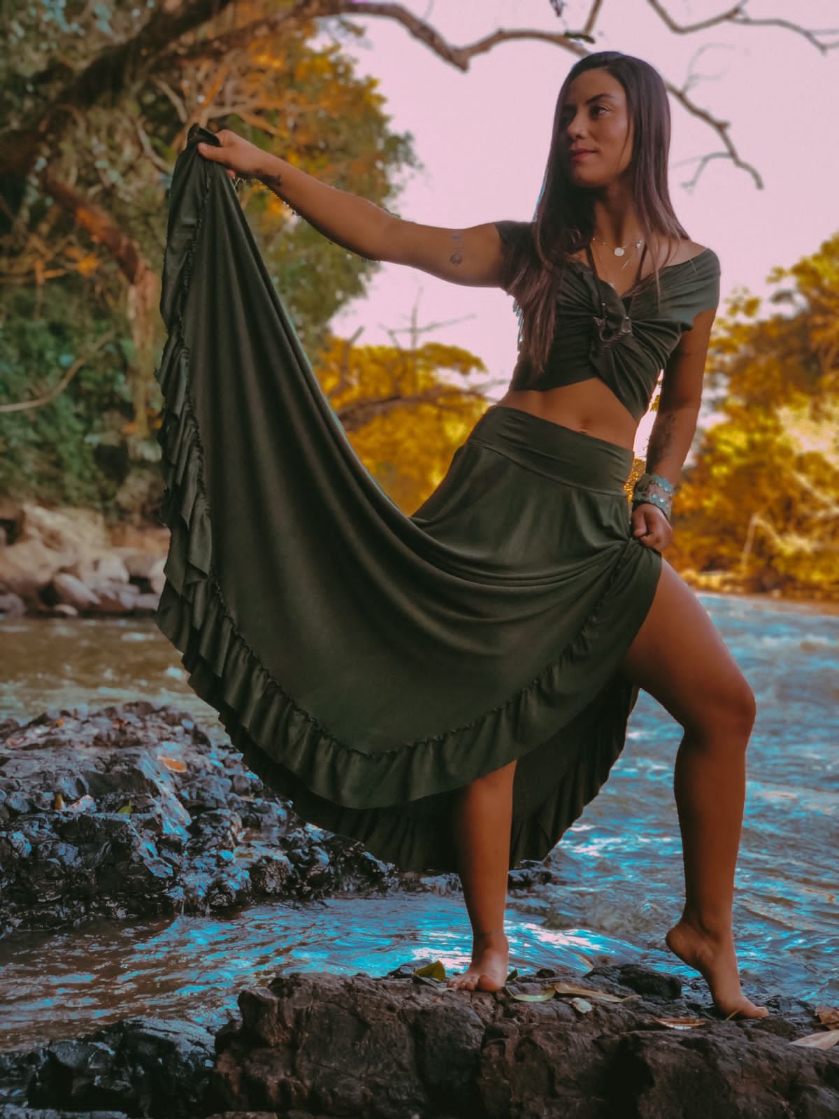 Sinta-se linda e poderosa: A Saia Cigana valoriza sua silhueta e te faz sentir confiante.