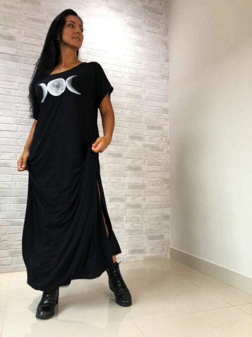 Versátil e elegante, este vestido é perfeito para eventos especiais, um jantar romântico ou mesmo para um passeio descontraído. A escolha é sua. Sinta-se linda, confortável e bem vestida com o vestido longo com mangas “Luas” da Evolução Eco.