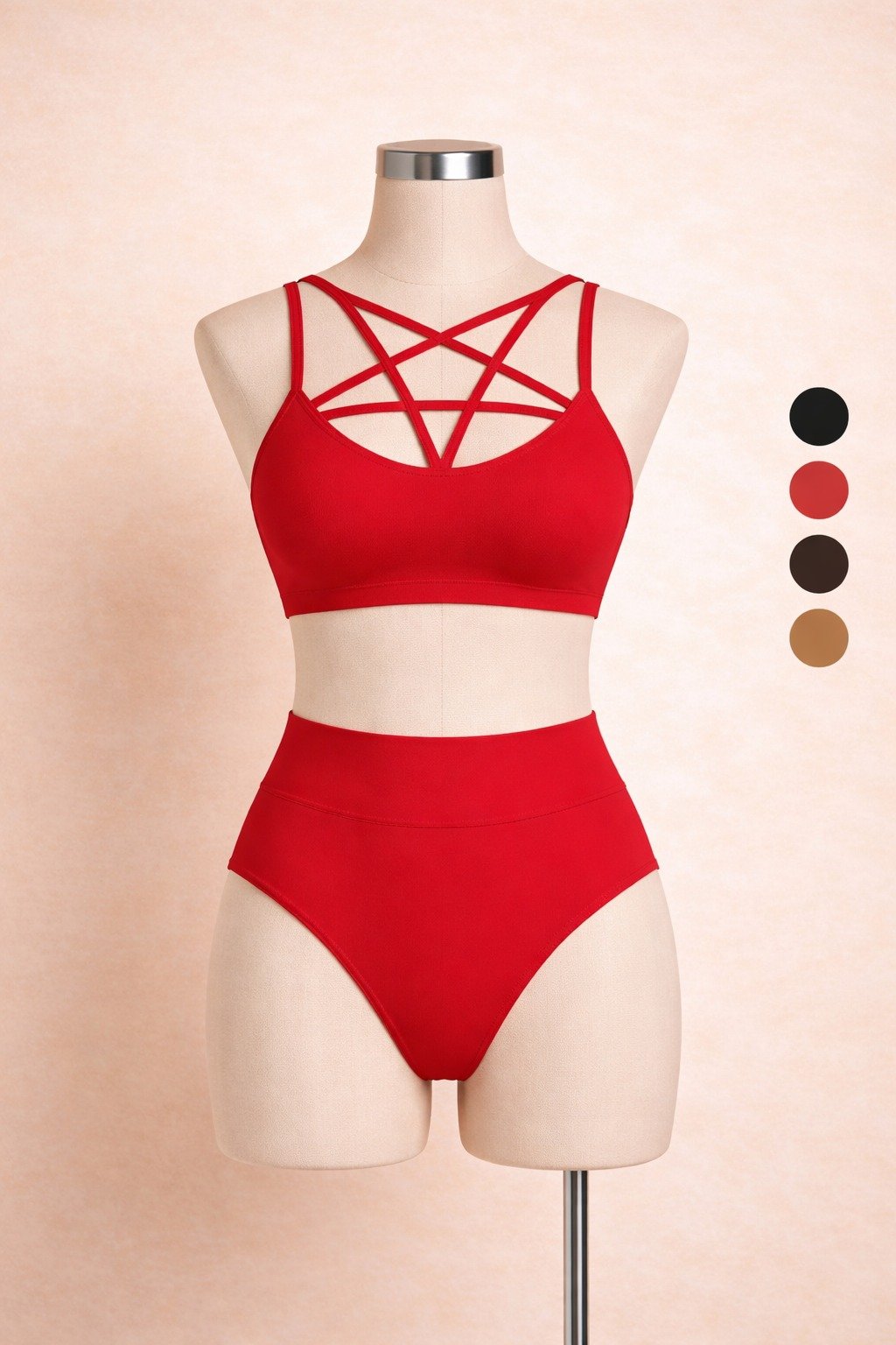 Conjunto simbólico e cheio de significado, com calcinha hot pant e top em visco torção. O pentagrama, presente nas alças e decote, representa a união e a síntese, além de ser um poderoso amuleto de proteção. Uma peça para mulheres que buscam estilo e espiritualidade.