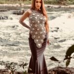 Sua estrutura imponente e brilho metálico transformam o comum em extraordinário, traduzindo a essência da moda sustentável em forma de escultura vestível.