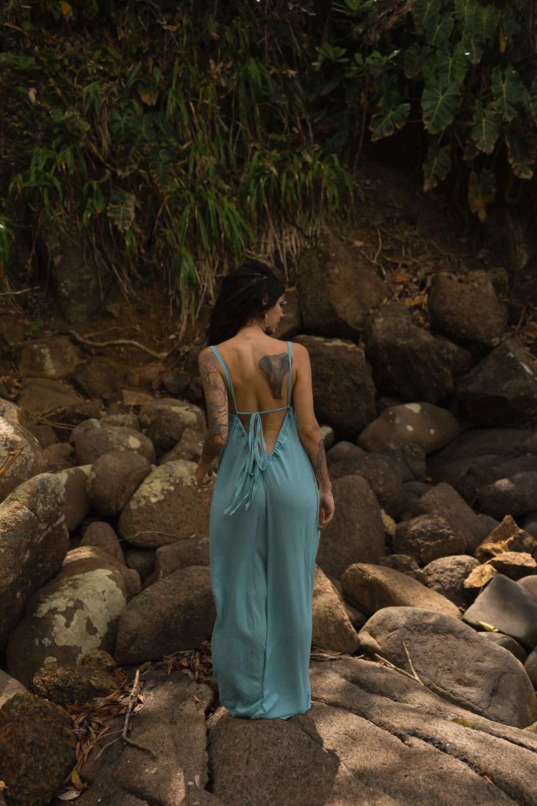 Modelagem de alças finas, decote delicado e costas totalmente abertas com amarração dupla — um convite para respirar o mundo com a pele.