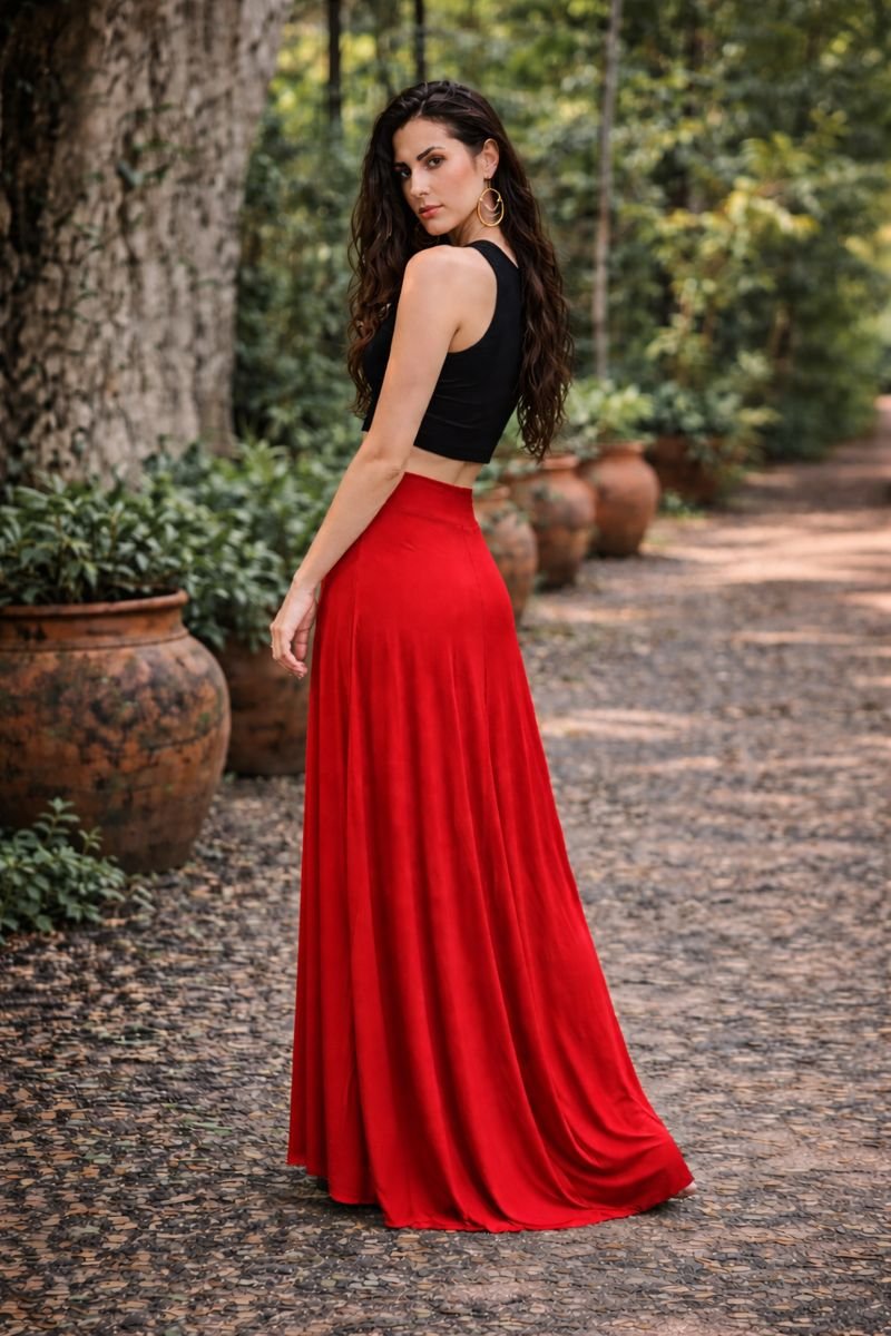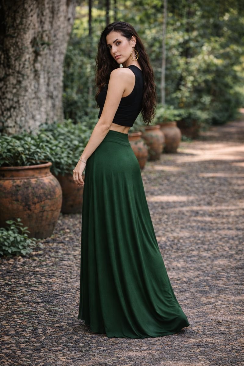 Esta saia é versátil, proporcionando elegância e conforto em diversas ocasiões, realçando a deusa que vive em nós, com seu tecido longo e fluido. 🌟💃