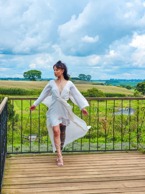 Nosso modelo longo com recortes no decote e no tronco, combinado com fendas generosas, é perfeito para quem deseja unir delicadeza, serenidade e poder em um só look.