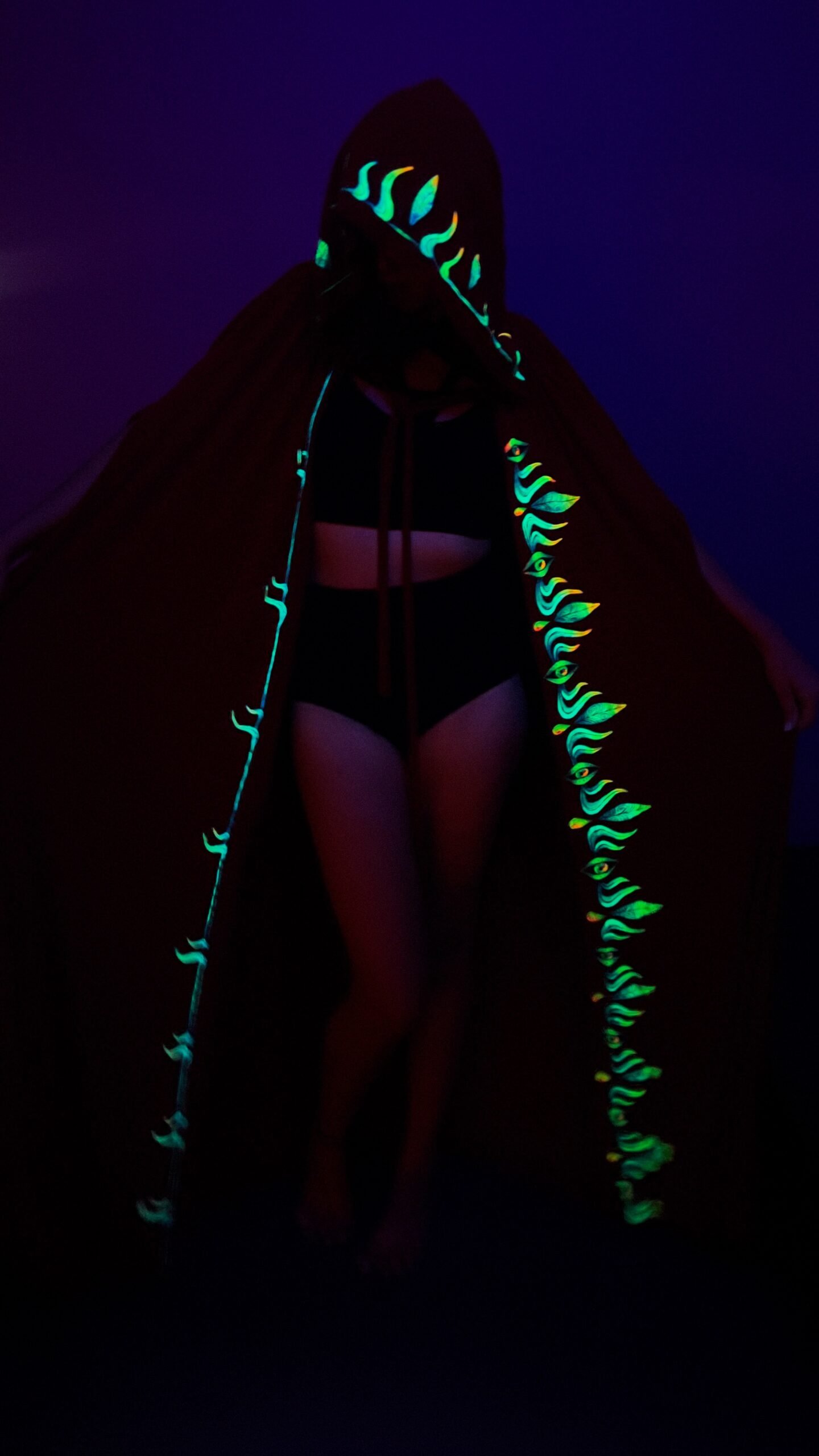 Costurado artesanalmente pela Evolução Eco, o manto é feito com tecidos de alta qualidade e respeito à Terra. Ao chegar nas mãos de Stella, ele recebe uma intervenção artística feita à mão, com tintas que reagem à luz negra, revelando uma segunda dimensão oculta da obra.